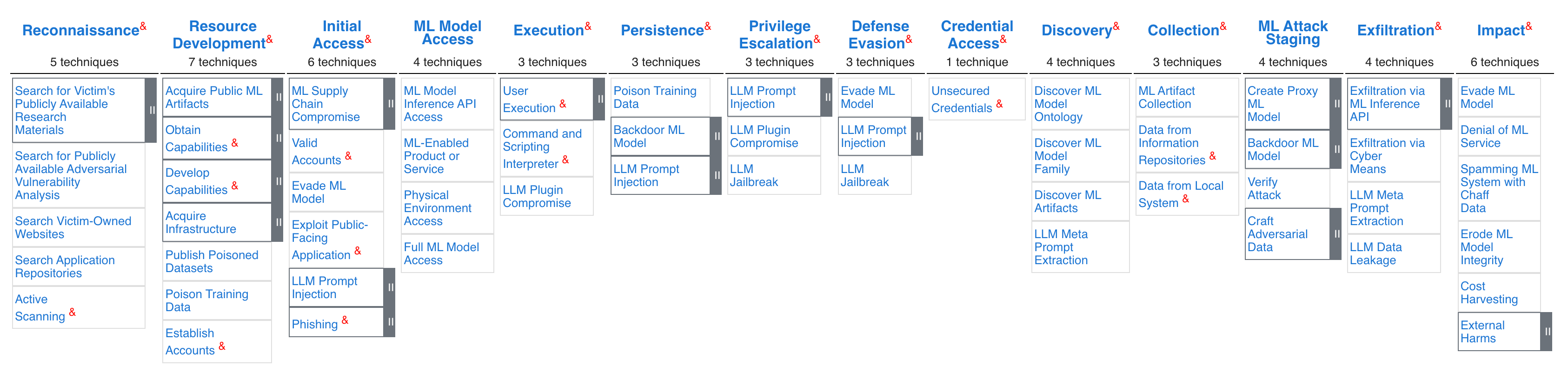 The ATLAS Matrix shows the progression of tactics used in attacks as columns from left to right. View the ATLAS matrix highlighted alongside ATT&CK Enterprise techniques on the ATLAS Navigator.