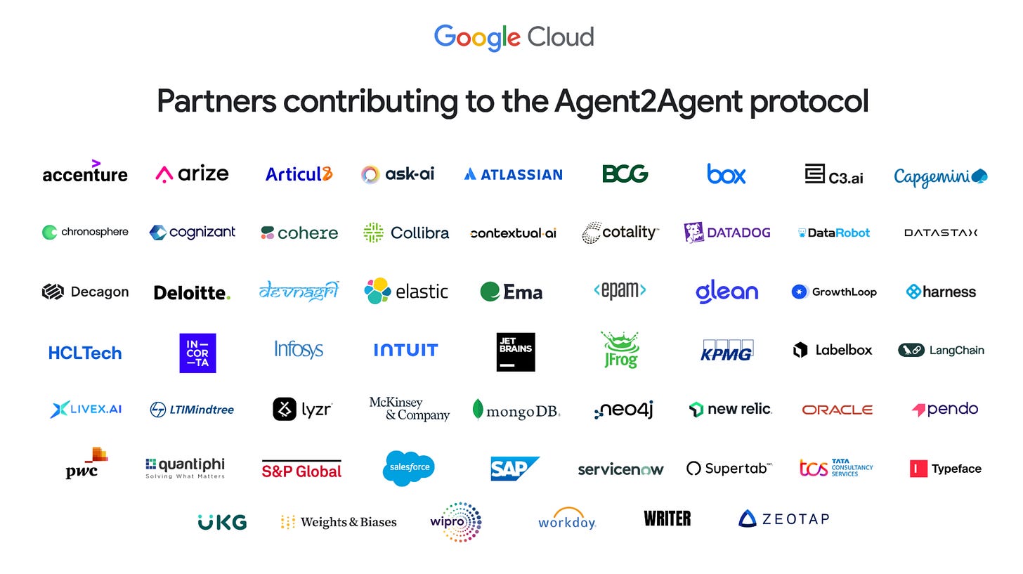 A2A is a new open protocol designed to solve agent interoperability issues and has been supported by more than 50 technology partners including Atlassian, Box, Cohere, Salesforce, SAP and leading service providers such as Accenture, BCG and Deloitte.