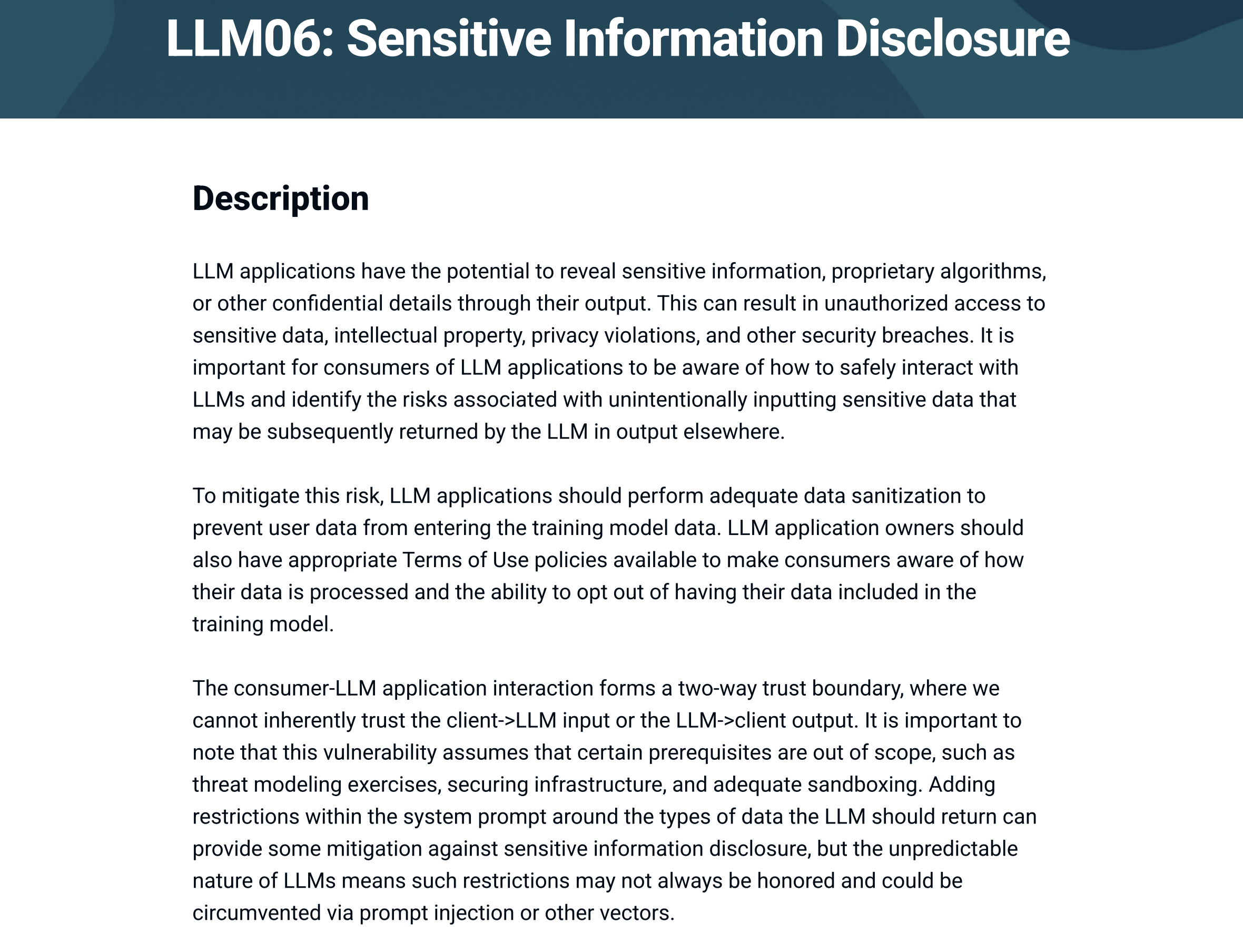 In practical terms, this issue often surfaces when LLMs are given access to broad knowledge bases within data sources. This includes proprietary or confidential information. For example, if a GenAI-powered chatbot in a corporate setting is allowed to interact with the entire company database, it might accidentally disclose sensitive details in its responses.