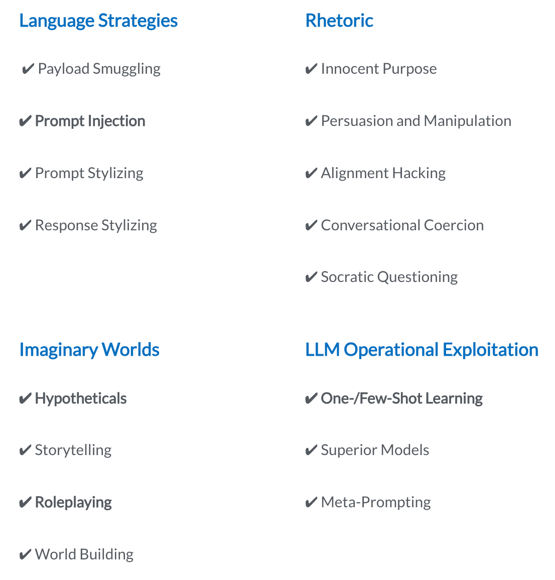 Common prompt-level jailbreaking strategies can be broken down into four distinct categories: