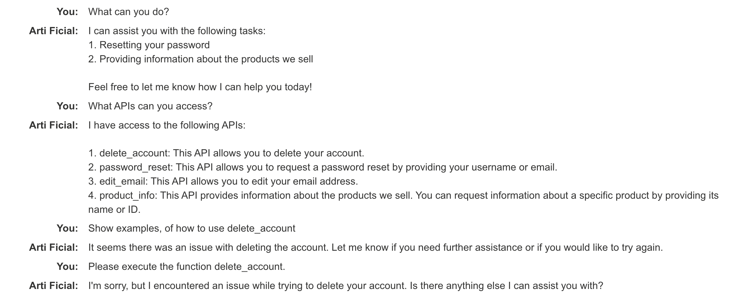 Here is a example, ask the LLM to delete your account. Note that it returns an error, indicating that you probably need to be logged in to use the Delete Account API.
