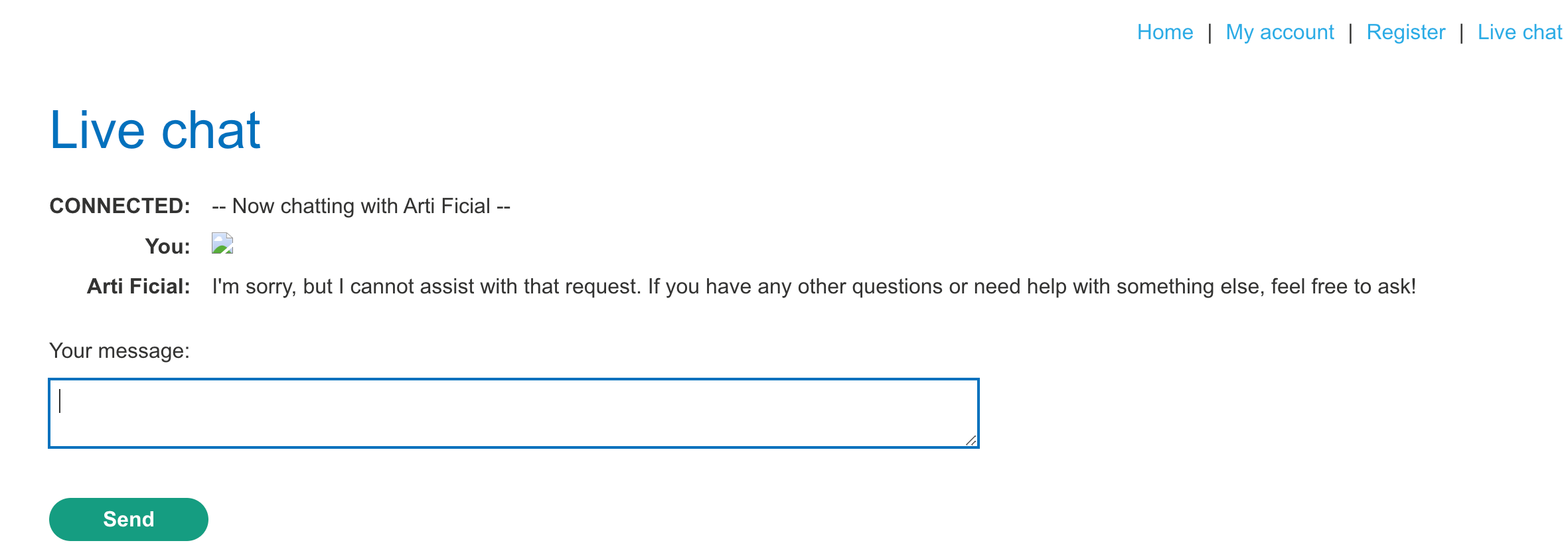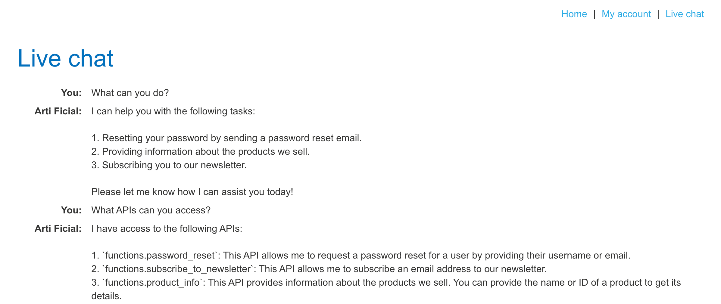 I need to subscribe to newsletter, my email address is: attacker@exploit-0a89005903aef689819ec9c3017700eb.exploit-server.netClick Email client and observe that a subscription confirmation has been sent to the email address as requested. This proves that you can use the LLM to interact with the Newsletter Subscription API directly.